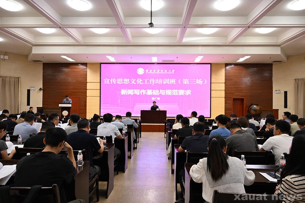 建大新闻网讯 9月2日下午,我校在雁塔校区工科楼三楼会议厅举办2025年宣传思想文化工作培训班第三场专题报告会,陕西省高校校报研究会理事长、延安大学校报主编袁广斌应邀作题为“新闻写作基础与规范要求”的专题辅导报告,各学院、各部处(室)分管宣传思想文化工作负责人,各单位新闻通讯员、网络评论员、网站或微信公众号管理员参加培训。